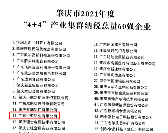 廣東中亞鋁業獲2021納稅100強企業榮耀